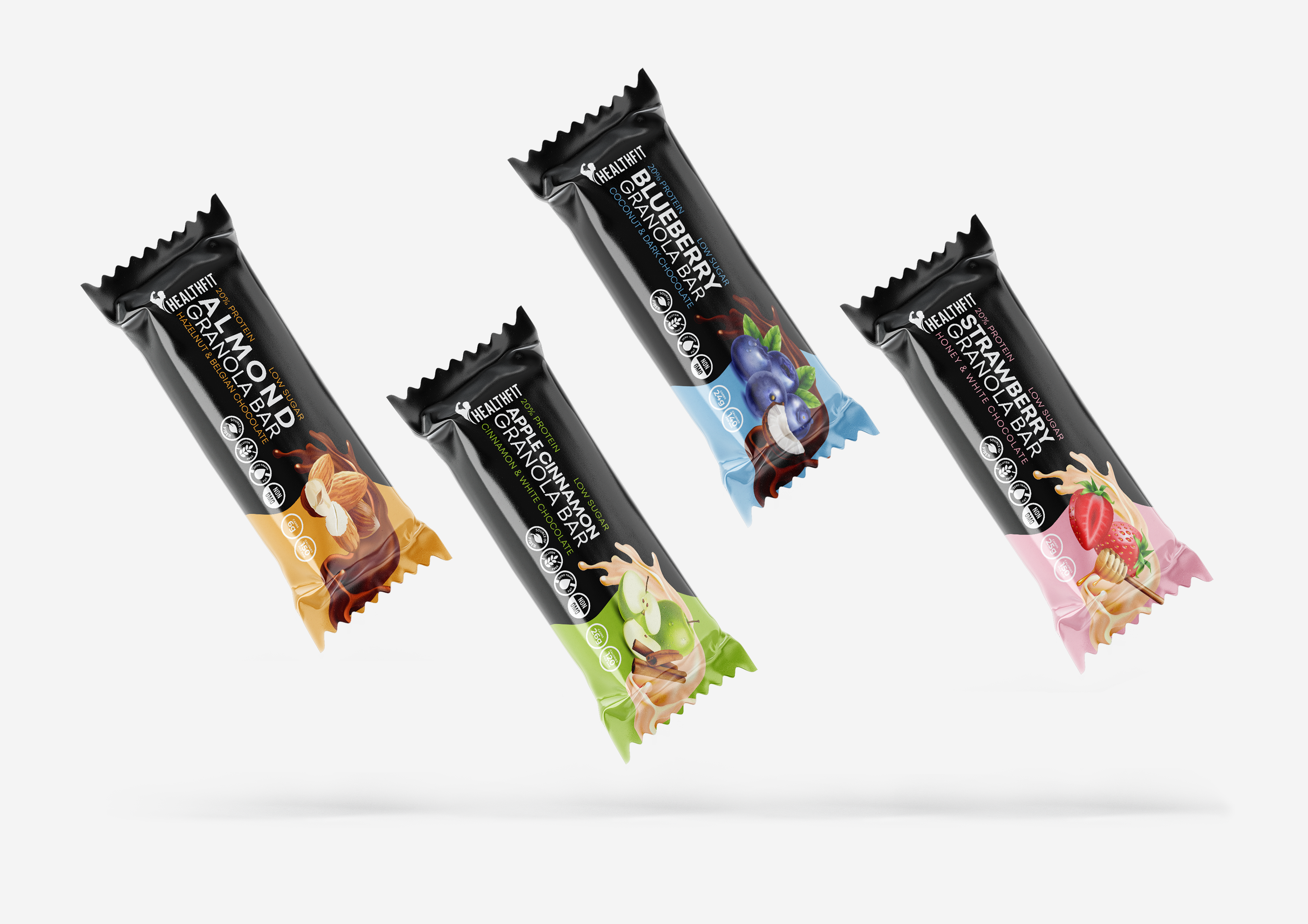 Packaging design for a range of healthy granola bars with 2 different flavours for the brand HealthFit