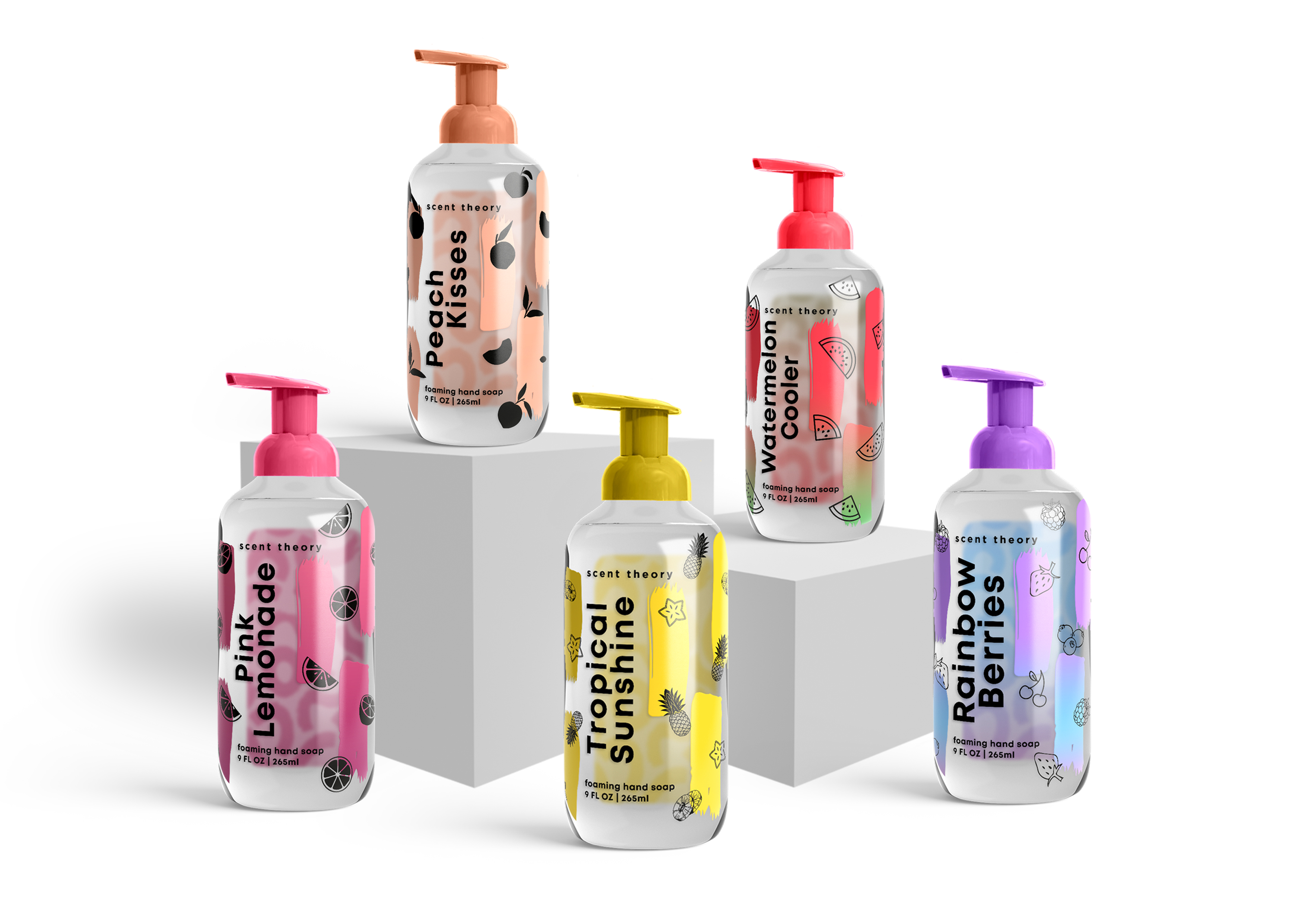 A set of 5 hand wash bottles for kids designed by me for a client that works with scent theory.